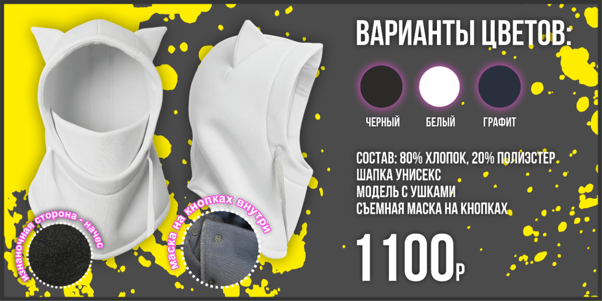 Защищает лицо от ветра и морозов в холодное время за счет маски на лице, которая является съемной частью с кнопками внутри. Можно нанести печать на маску, уши, и прочие части шапки избегая швов