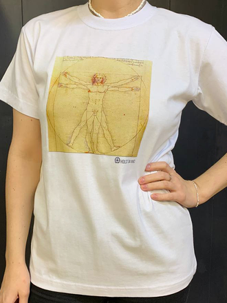 Футболка с культовым принтом «Витрувианский человек» Леонардо да Винчи - гармония искусства и стиля в вашем гардеробе. Качественный хлопок, универсальный фасон, быстрая доставка.