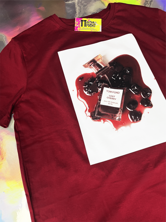Бордовая футболка унисекс с ярким фотопринтом "Lost Cherry" - это стильный способ выделиться из толпы. На груди - эффектное изображение флакона парфюма Tom Ford Lost Cherry, утопающего в вишнёвом сиропе и ягодах. Свободный крой и натуральный хлопок обеспечивают комфорт даже в жаркую погоду, а насыщенный цвет и сочный принт делают эту модель отличным выбором для прогулок, вечеринок и повседневной носки.