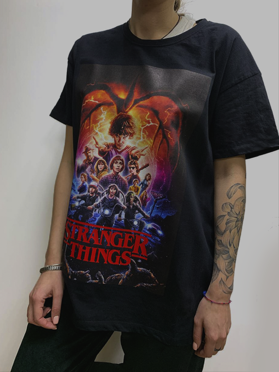 Футболка унисекс с ярким принтом по мотивам культового сериала "Stranger Things" - идеальный выбор для поклонников атмосферы 80-х и мистических приключений. На груди - красочный постер с главными героями, демогоргоном и узнаваемым логотипом, выполненный в насыщенных неоново-красных и фиолетовых оттенках. Модель выполнена из мягкого хлопка, приятного к телу, не сковывает движений и отлично держит форму даже после многочисленных стирок. Свободный крой и размер L подойдут как мужчинам, так и женщинам, создавая модный расслабленный силуэт в стиле oversize.