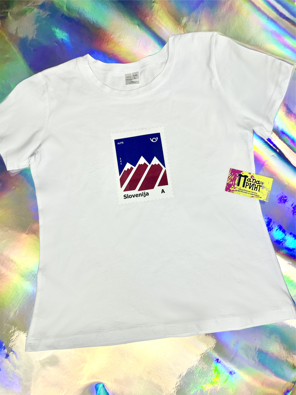 Белая женская футболка с оригинальным принтом в виде почтовой марки "Slovenija Alpe" - стильный и универсальный элемент гардероба для любого сезона. Принт с изображением горных вершин и лаконичным дизайном вдохновлён природой Словении и идеально подойдёт для любительниц путешествий, активного образа жизни и уникальных аксессуаров. Модель выполнена из мягкого и дышащего хлопка, хорошо садится по фигуре и сохраняет форму после стирки.