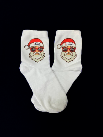 Яркие женские носки с принтом "Санта I-Legal" в красной шапке. Отличный выбор для новогоднего подарка, создания праздничного настроения и стильного образа на Рождество. Качественный принт, мягкий материал, универсальный размер для женщин!
