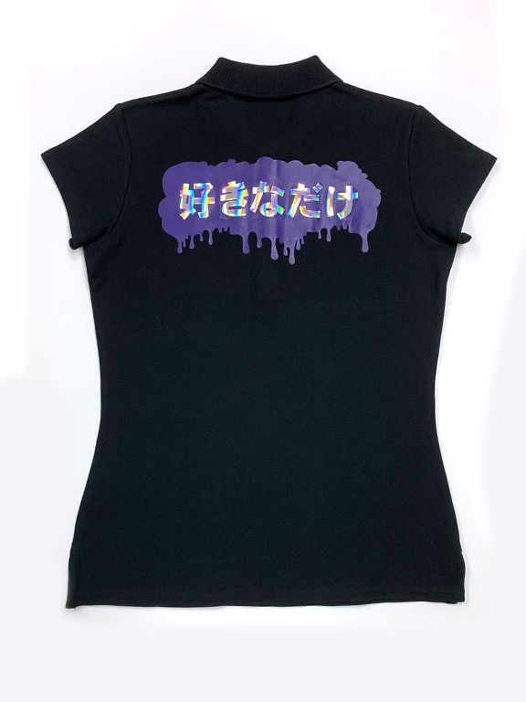 Стильная женская рубашка-поло чёрного цвета с коротким рукавом и оригинальным неоновым принтом с надписью на японском языке на груди. Модель выполнена из приятного к телу материала, хорошо держит форму и обеспечивает комфорт в течение всего дня. Классический воротник, застёжка на пуговицы и лаконичный дизайн делают это поло универсальным выбором для повседневных образов, учёбы или офиса в стиле кэжуал. Яркий акцент в виде принта добавляет индивидуальности и хорошего настроения.