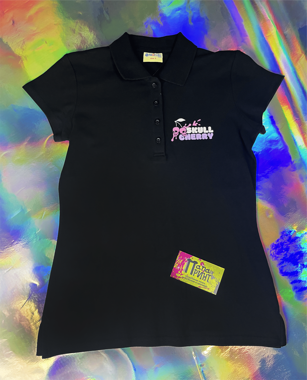 Стильная женская рубашка поло чёрного цвета с оригинальным принтом "Skull Cherry" - идеальный выбор для тех, кто ценит индивидуальность и комфорт. Модель выполнена из приятного к телу и эластичного материала пике (65% хлопок, 35% полиэстер), что обеспечивает отличную посадку и долговечность. Приталенный силуэт подчёркивает фигуру, а классический отложной воротник и застёжка на пуговицы делают рубашку универсальной для любых случаев - от повседневной носки до тематических мероприятий.