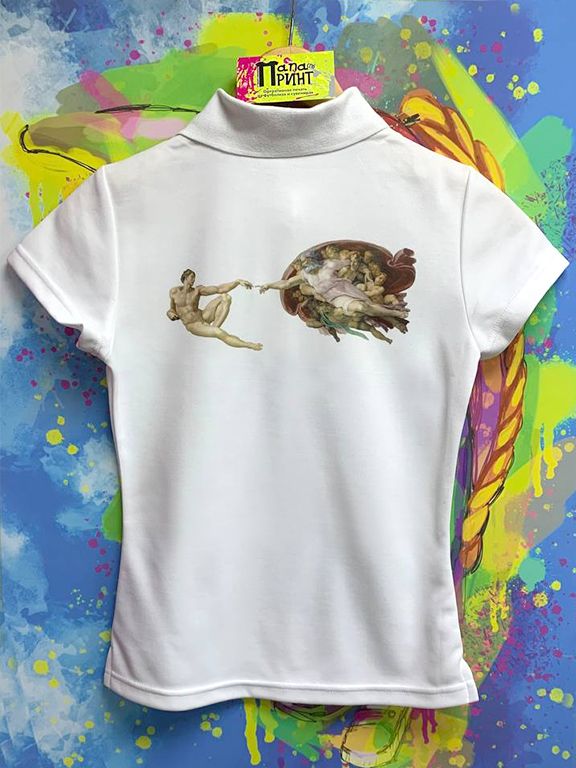 Стильная женская рубашка-поло белого цвета с арт-принтом "Creation Touch": на спине изображён фрагмент знаменитой фрески Микеланджело «Сотворение Адама» с Сикстинской капеллы. Такой дизайн добавляет образу утончённости, интеллектуального шарма и привлекает внимание к деталям. Модель выполнена из мягкого, приятного к телу материала, хорошо держит форму и подходит для повседневной носки, учёбы или офиса в стиле кэжуал. Размер XS идеально садится по фигуре, подчёркивая женственность и индивидуальность. Отличный выбор для поклонниц искусства и необычных вещей.